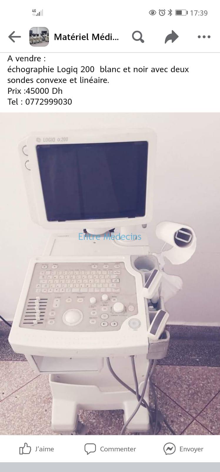 A vendre : echographe Logiq 200 blanc et noir avec deux sondes convexe et linéaire.